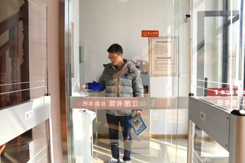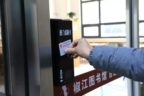 书吧采用自动门刷卡门禁,大门的玻璃上贴着大红色的几个字并指有箭头“开门请在左边刷身份证或市民卡”,身份证即二代居民身份证,市民卡即社会保障卡。