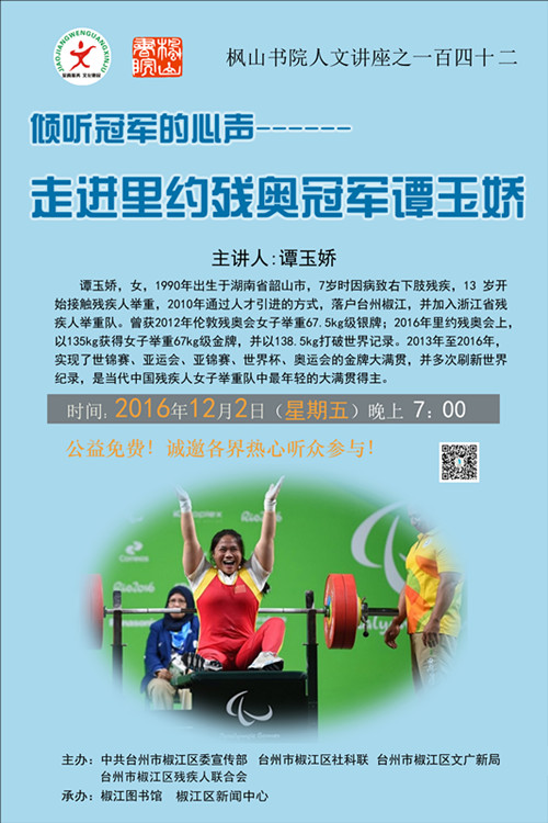 枫山书院讲座(第142讲): 倾听冠军的心声一一走进里约残奥冠军谭玉娇